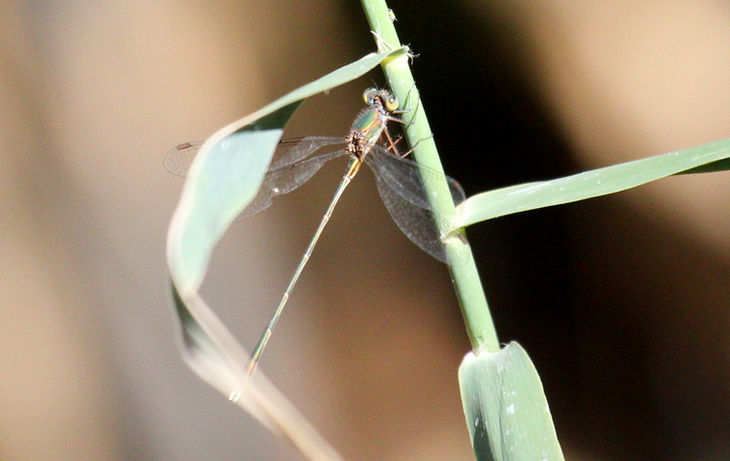 The Southern emerald damsel or migrant spreadwing, as it is also called, has a body length of 40 to 45mm. Unlike most damselflies, this species holds its wings away from its body when at rest (hence spreadwing). The males' body is emerald green, apart from the claspers at the end of the abdomen, which are pale. The female is light and dark brown with a pale ovipositor (egg layer). Both sexes have bicoloured pterostigmata, brown and white spots on the wing tips.