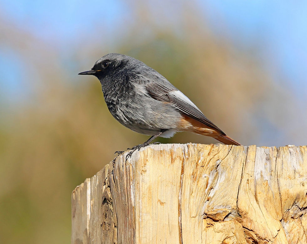 This beautiful little bird is becoming quite common here on Kefalonia during the Winter. They are 140mm long, with the male having smokey grey to black upper parts and a black breast. The lower belly and tail are orange red with the 2 central tail feathers being reddish brown. The female is grey, brown overall, except for the orange red rump and tail. As soon as this bird takes flight, the flash of orangey red under the tail helps to identify them.