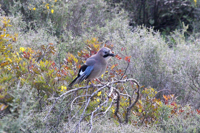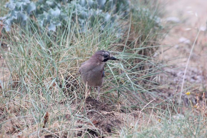 The jay is the most colourful of the crow family but is shyer than the other crows. It is mostly pinkish grey-brown with a white throat, black moustache stripe and a black streaked white crown. On the front of the wing is the splendid blue panel with fine black markings. When it is flying, it shows a striking white rump patch at the base of the tail, which is black. When it is on the ground, it moves with exaggerated hops.