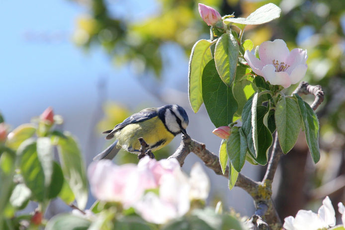 When you see this tit perching on a twig, I often think it should have been named a yellow tit. It is not until it takes to the skies that the blue wings become apparent. The blue tit looks like it has no neck and has a distinctive square shaped body, but it is still an attractive little bird and a favourite of mine. It has a white face with a black eye stripe and blue cap. The underparts are yellow with a narrow greyish-black central stripe on its belly. Their wings are blueish with bright blue on the coverts and wing bend. The female is similarly marked but with duller colours.