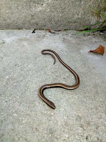 The slow worm is neither a worm nor a snake, but is in fact, a legless lizard. Its identity is given away by its ability to shed its tail (autotomy - see the Balkan green for details), and blink with its eyelids.