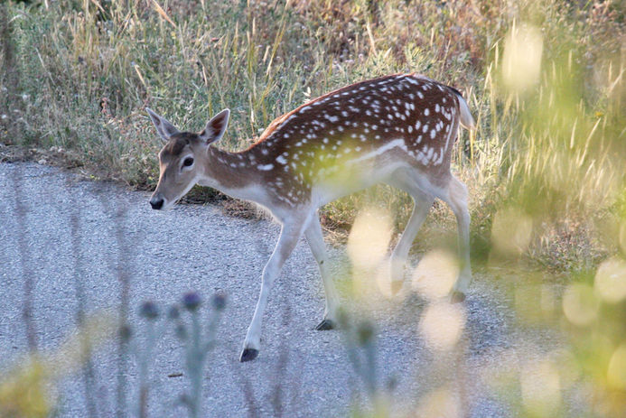 If alarmed the deer will issue a short, loud bark and will also bounce on all 4 legs held straight. This is called pronging or stotting and it tells the predator that the deer is fit and healthy and it would be difficult to catch. The rut is in October and fawns are born in late summer, the following year. Fallow deer will eat young shoots and tree bark, as well as saplings, fruit and acorns. They prefer open woodland and pasture, but will happily graze a farmer's crops. I have seen them on the wooded slopes, in the mountains of Southeast Kefalonia.
