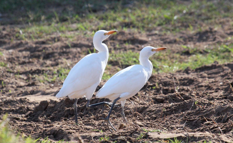 This small, stocky heron is 460 to 560mm tall with an 880 to 960mm wingspan. Cattle egrets have white plumage, a yellow bill (dark in juveniles), and greyish yellow legs. During the breeding season, both sexes develop orange/buff plumes on their backs, breast and crown. The bill, legs and irises become bright red for a brief time, prior to mating.