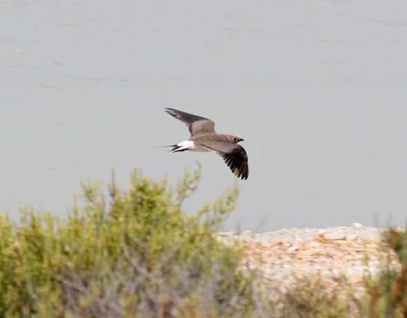 Although the collared pratincole is classed as a wader, this bird catches its prey on the wing. It twists and turns like a tern while chasing its food. Up to 280mm long, it has long pointed wings which can reach 700mm long. They have short, dark legs and a short dark bill, but the tail is long and forked. The belly is white and the under wings are chestnut coloured. The back and head are brown, as are the upper wings, but the flight feathers are darker. The adult summer plumage includes a yellow chin, bordered in black with a red spot behind the bill.