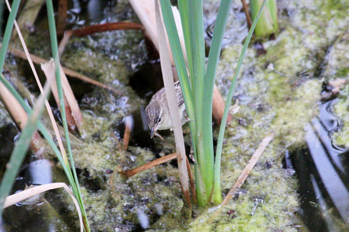 I am in the realm of the small brown bird with this little one, so I could be mistaken but I think this is a sedge warbler. They have a white or off-white eye stripe called a supercilium which is what leads me to think it is a sedge warbler. Their backs and top of the head are dark streaked, with their heads being darker on the sides. Their chests are a buff colour which fades to a white underside.
