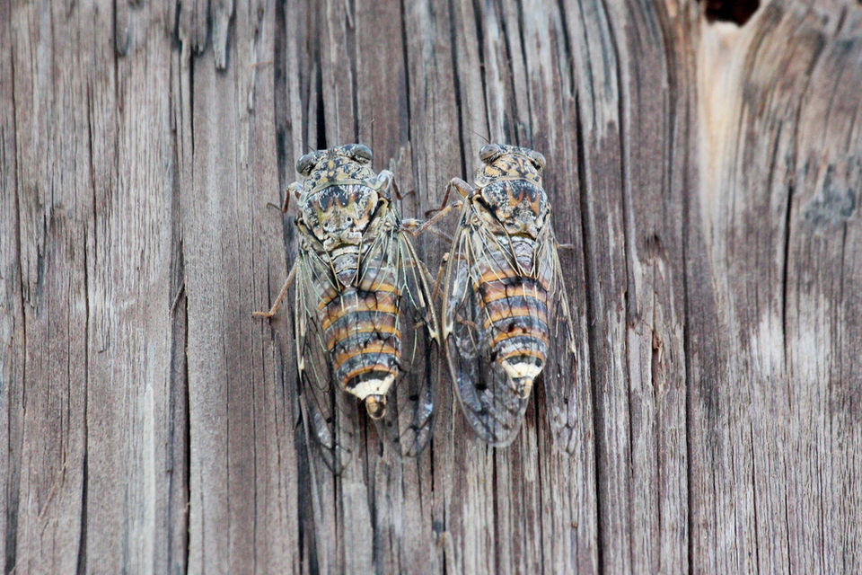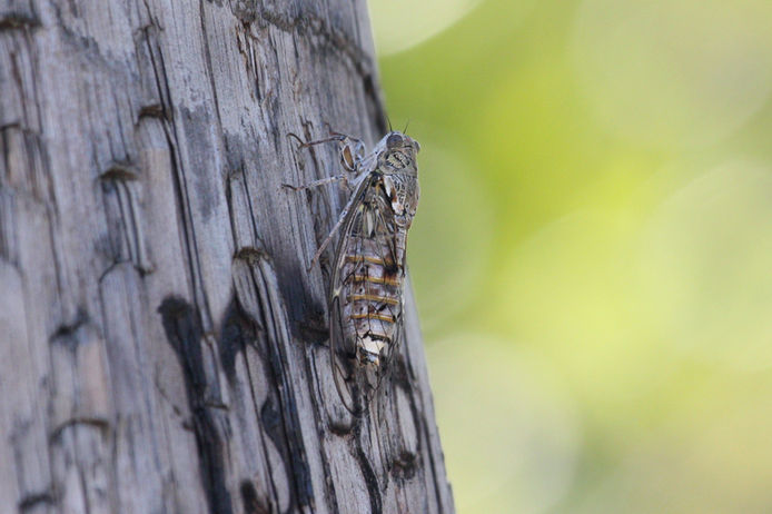 The sound made by the males is produced in their hollow abdomens which act as sound chambers. A special structure called a tymbal is buckled and unbuckled using large muscles and this produces the sound. They turn their ears off whilst calling for the females as otherwise they would go deaf. Also in some species, the wings are rubbed quickly over ridges on their backs. Cicadas live from 2 to 5 years, but the majority of that time is spent in the soil as nymphs. When they moult and emerge as adults, they only survive for another 2 to 3 weeks. They drink sap from trees and bushes.