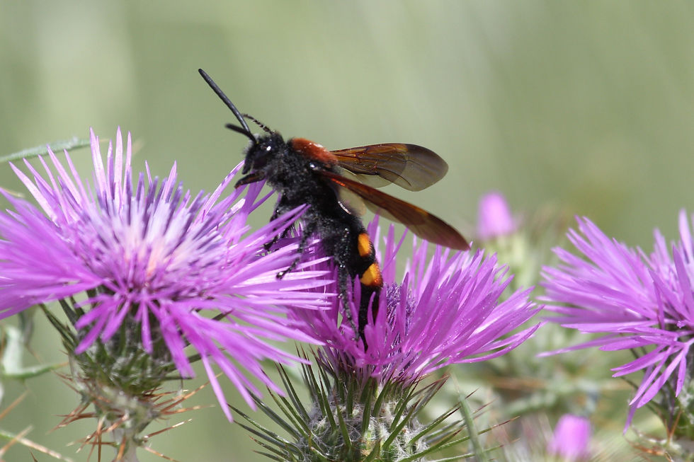 The adult mammoth wasps feed on nectar from flowers and I have observed that they prefer blue flowers. It is only the female that can sting and even though she is massive, the sting is no worse than a bee. They are not aggressive and do not form swarms, and so if you see one do not be afraid, unless you are the larva of the rhinoceros beetle. They are found from May until September near compost heaps, manure piles and rotting wood, as this is where the rhinoceros beetles are mostly found.