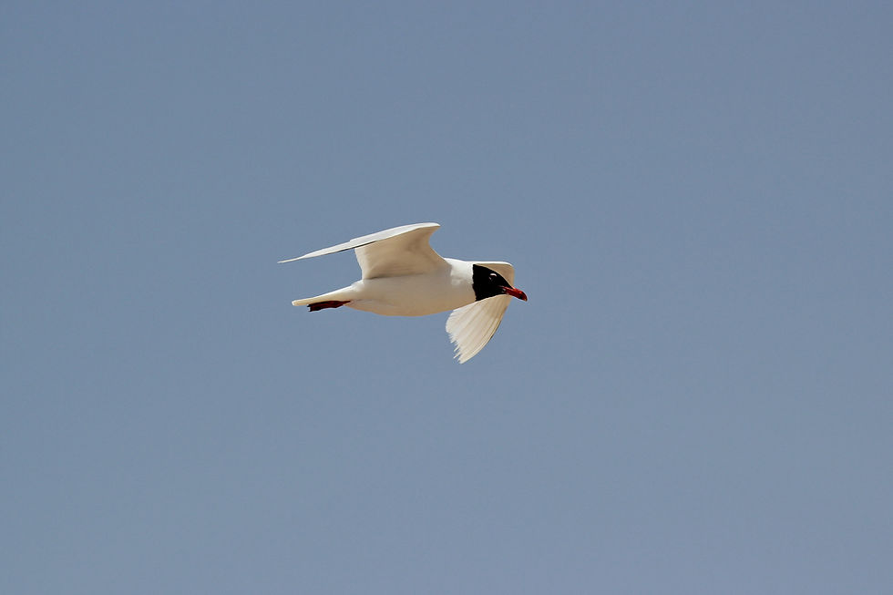 This gull has 3 age groups, meaning it looks different in each of its first 3 years, see the bible for details. As an adult, it has a black head during the Summer and a dark patch around its eye in the Winter. It has a thick blood red beak with a black band near the tip and reddish- brown legs. Its main distinguishing feature is having all white wings, no dark or black markings, and white eyelids, seen clearly in Summer against the black hood.