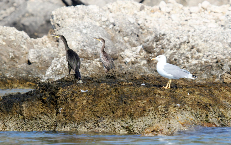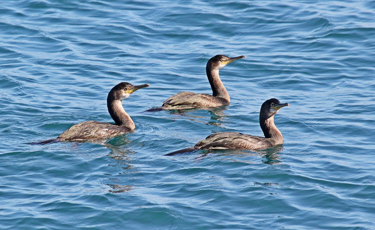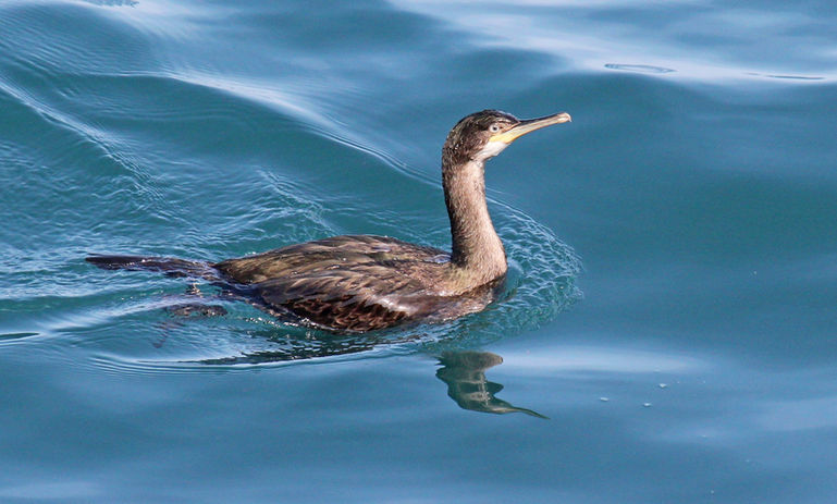 The European shag or just shag, is a species of cormorant. They are 680 to 780mm long with a wingspan of 950 to 1100mm. The feathers are black with a metallic green tinge. They have a long tail, slim neck (straight in flight), and a small crest in the breeding season. The crown of the head is rounded with a steep forehead. The bill is yellow and narrow. When flying, it flies close to the water with fast wing beats and no gliding. On the water, they leap clear of the surface before diving. They are rarely seen inland.