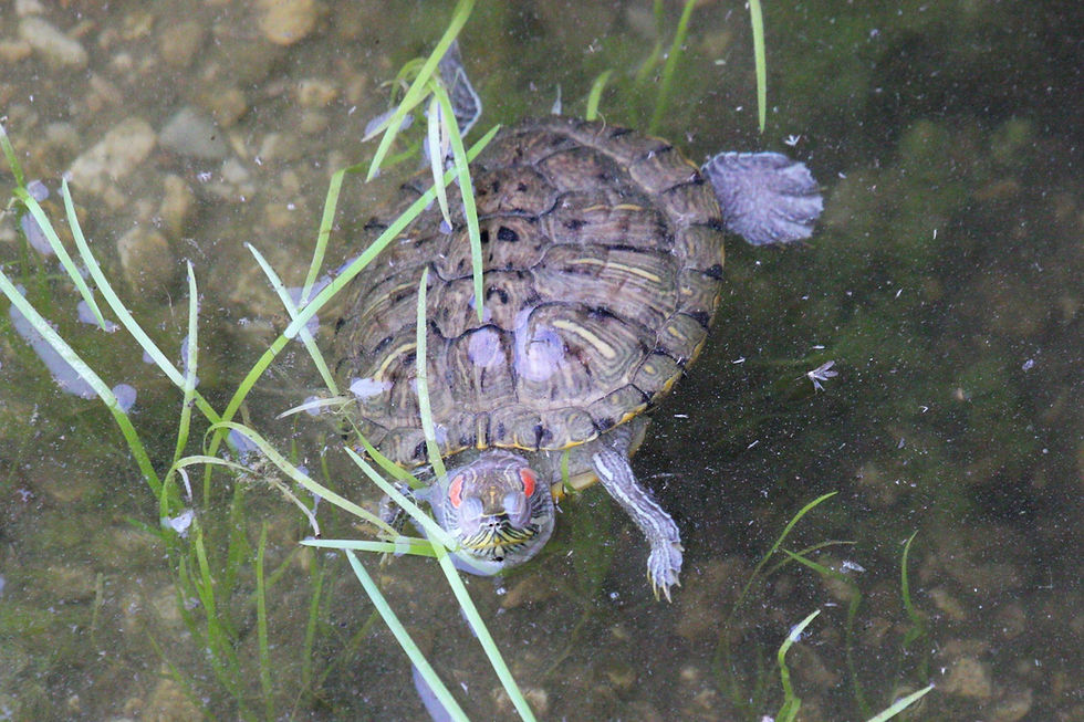 The individual I discovered at my local weir was only about 125mm in length, but red-eared sliders can attain 330mm, which is a big terrapin. These reptiles came originally from the Southern United States and northern Mexico and were imported worldwide as pets. Due to pet releases and escapees, these terrapins can now be found throughout southern Europe. They are very invasive and being stronger and more agile than the resident terrapins, they can displace them.