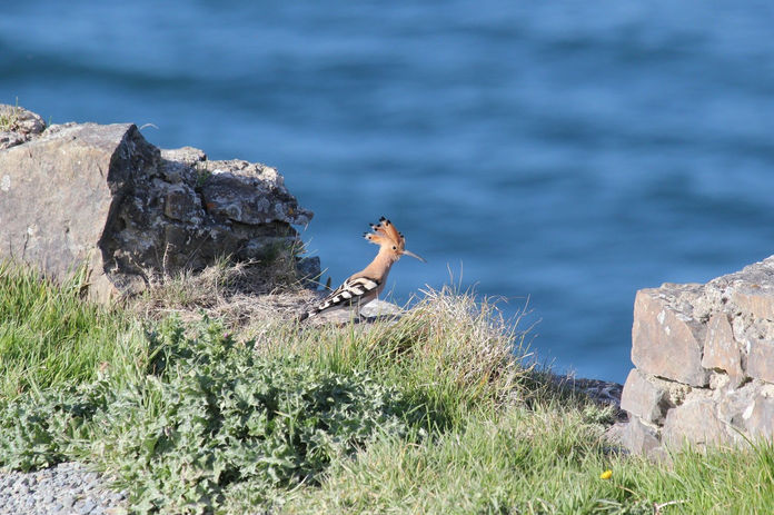 A hoopoe is spotted on Lundy, usually in Spring, and about once a year. A pink/buff bird with striking black and white striped wings and a black tipped pink crest which it raises when alarmed and as it lands.