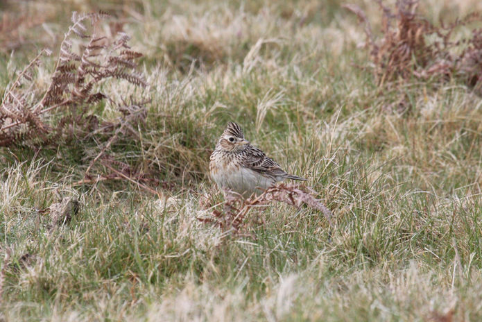 With a brown back and wings, heavily streaked, a white belly and short blunt crest, the skylark being larger than the meadow pipit, can be identified by its angular wings, song and flight.
